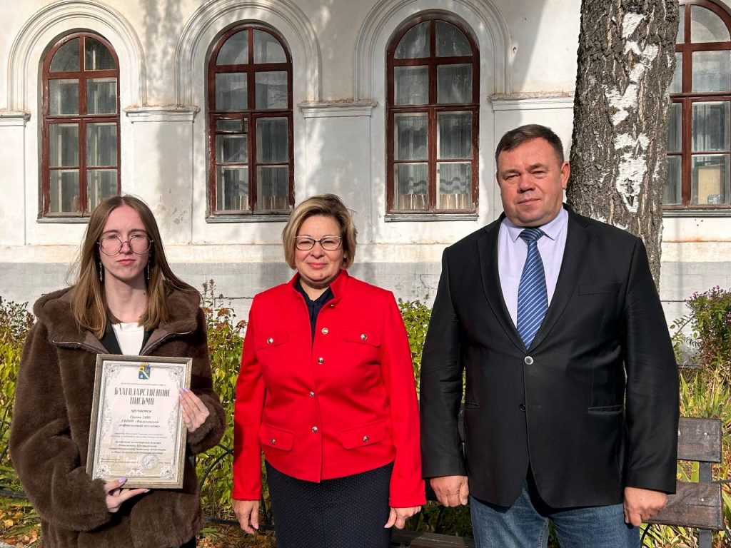 29 сентября на линейке Председатель Думы Касимовского муниципального округа Ирина Ивановна Ганина наградила Благодарственными письмами Думы Касимовского муниципального округа студентов групп 23Х-1, 24Н-1, 23А-1 за помощь в сборе урожая сельскохозяйственных культур на территории Шостьенского Никольского ставропигиального женского монастыря.