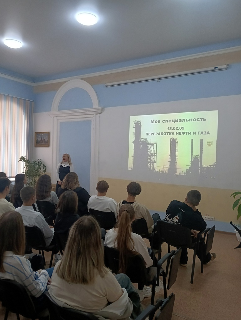 8 октября 2025 года председателем цикловой комиссии по переработке нефти и газа Т.Е. Денисовой и преподавателем спецдисциплин Р.В. Сергиенко в рамках федерального проекта «Профессионалитет» был проведен урок «Моя специальность «Переработка нефти и газа» для студентов групп 22Н-1 и 24Н-1.