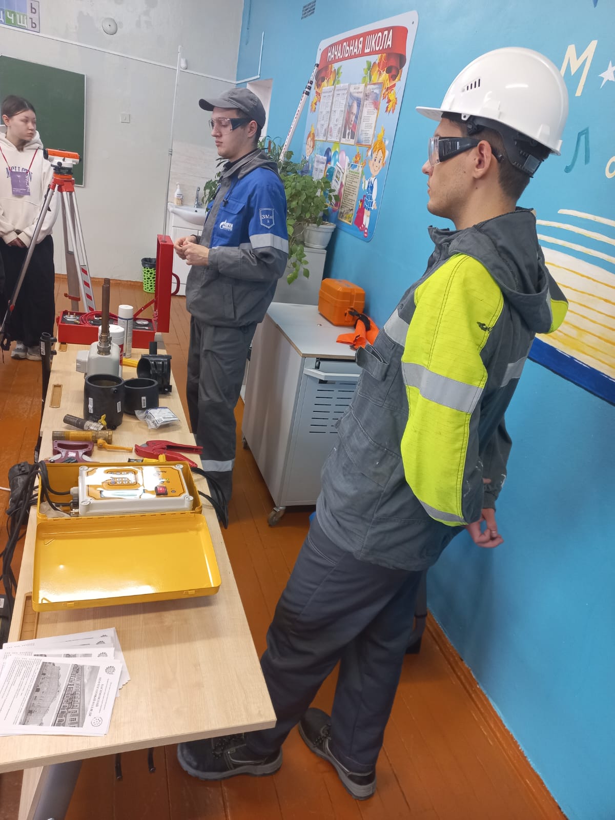 Мастер прозводственного обучения А. Н. Ветерков со студентами группы 23 Г-1 специальности «Монтаж и эксплуатация оборудования и систем газоснабжения» Ильей Волгиным и Леонидом Кривополом провели для школьников мастер-класс по соединению полиэтиленовых труб для газоснабжения.