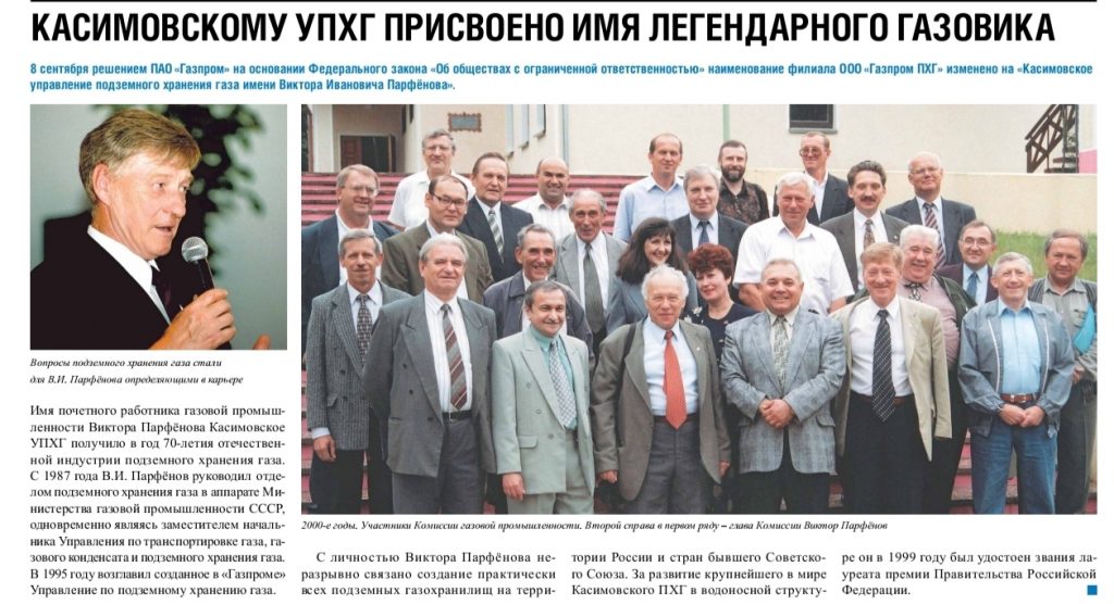 8 сентября 2025 года решением ПАО «Газпром» наименование филиала ООО «Газпром ПХГ» изменено на «Касимовское управление подземного хранения газа имени Виктора Ивановича Парфёнова».