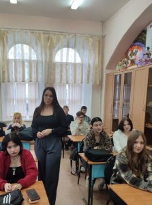 На встрече со студентами группы 25 ТТ рассказала о себе, отметив, что образование — это фундамент, на котором строится успешное будущее.